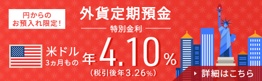 - 期間中であっても、円定期預金の預入額が一定額に達した場合にはキャンペーンを終了する場合があります。また、金融情勢の変化等により金利水準やキャンペーン期間の見直しをさせていただく場合があります。最新の金利は当社WEBサイトにてご確認ください。