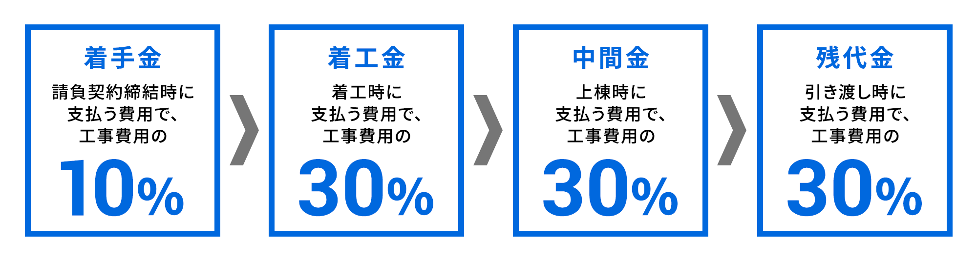 また、建築工事費用は、「着手金」「着工金」「中間金」「残代金」と4回に分けて支払います。それぞれの費用の目安は以下です。