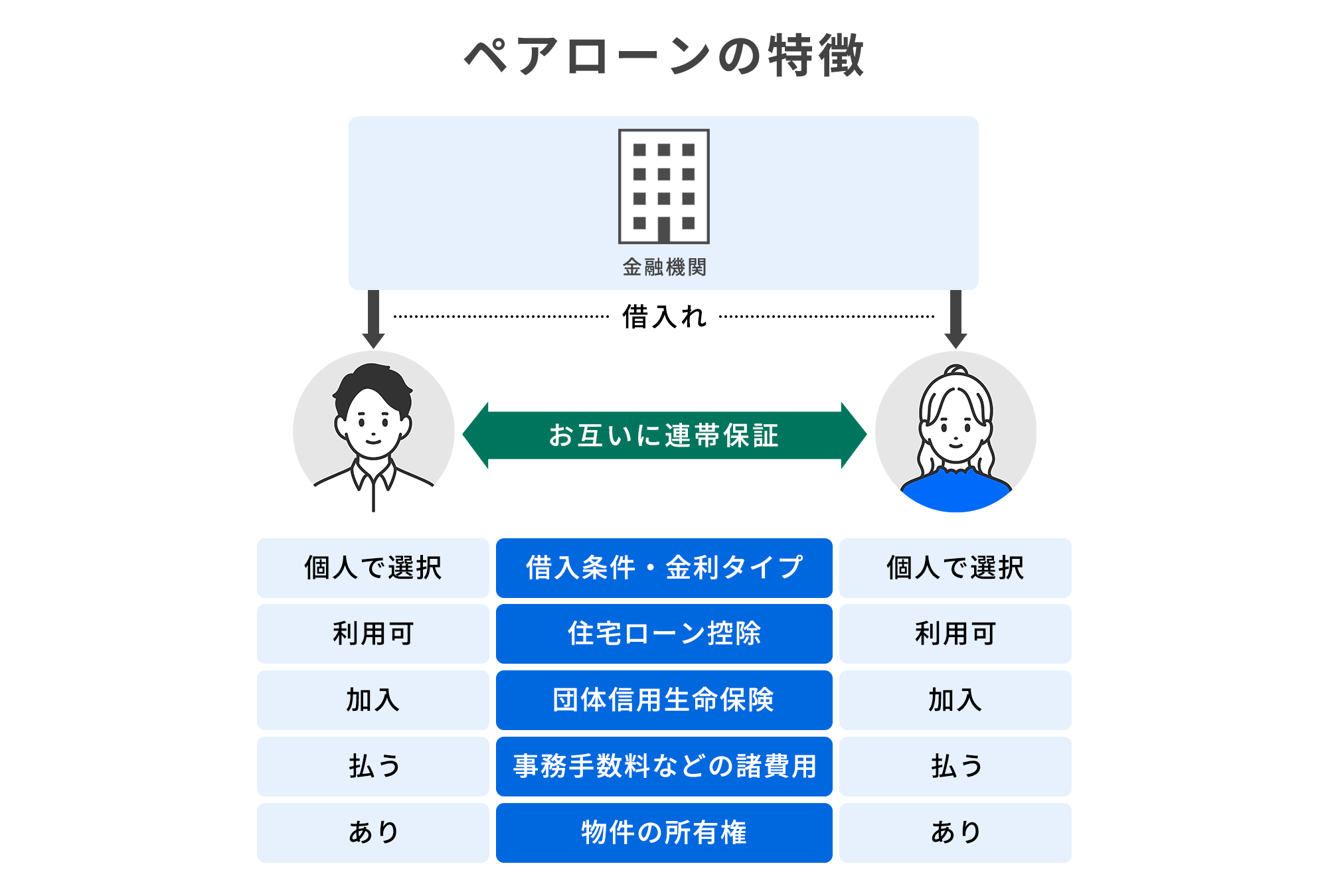 • ペアローンとは、一つの物件に対し夫婦又は親子がそれぞれ債務者となって住宅ローンを利用する方法。